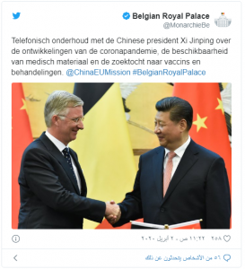 في إتصال هاتفي بين ملك بلجيكا فيليب، وشي جين بينغ رئيس جمهورية الصين الشعبية، إتفق الزعيمانا على العمل معاً بشكل أوثق لضمان شحنات الإمدادات الطبية، كما ناقش التعاون في مجالات العلاج وتطوير لقاح فيروس كورونا .